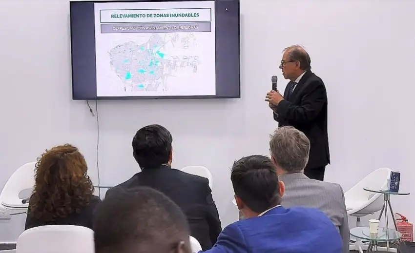 En su disertación, Tassano planteó los relevamientos previos al diseño del Plan Hídrico, como también sus ejes principales: el mantenimiento y la recuperación de la red pluvial existente (desobstrucción de ductos y canales), las obras de adaptación de pluviales, las obras nuevas de desagüe pluvial y el impacto hidrológico cero.